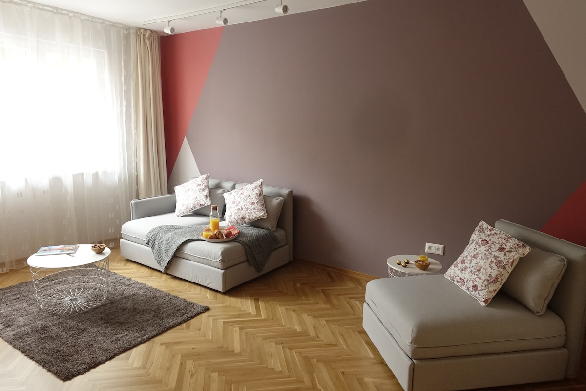 Our charming apartment is located in the heart of the city and similarly to the rhythm of the town mixes modern furnishing in a calm and relaxing atmosphere. The flat is on a 5 minutes walking distance from the main pedestrian street, the central garden and the old town. The area offers a variety of shops, markets, restaurants and bars. We aim that our guests enjoy home comfort during their stay and experience Plovdiv at its best.