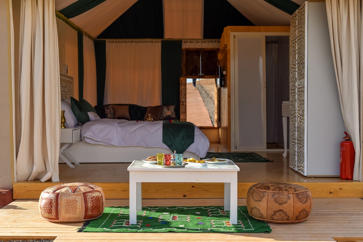 Disfruta del desierto de Agafay a solo 40 minutos de Marrakech en tu tienda de lujo privada. Cada tienda combina el auténtico encanto marroquí con las comodidades modernas, como una cama tamaño queen, baño privado, aire acondicionado y minibar. Relájate en tu piscina privada, disfruta de cenas románticas bajo las estrellas y admira las impresionantes vistas del atardecer en las montañas del Atlas. Perfecto para parejas, amigos o viajeros que buscan una escapada de lujo al desierto, glamping exclusivo y experiencias de aventura en el desierto.
