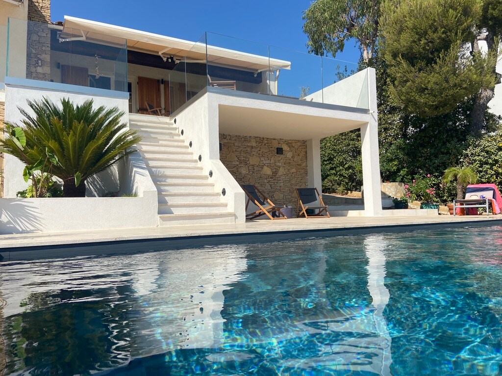 Jolie maison vue mer totalement rénovée, dans quartier tranquille. Aménagée avec goût pour un séjour détente et confort.Garanti... Superbe terrasse avec vue sur mer, à 5 minutes à pied de la plage, 2 minutes à pied des tennis, 2 minutes à pied glacier restaurant, à 2 minutes à pied centre esthétique et coiffure. 15 minutes à pied du centre-village et port. Longues balades sur la corniche de 4 km à 200 m de la maison. Linge de maison fourni (draps, serviettes, torchons) ménage inclus