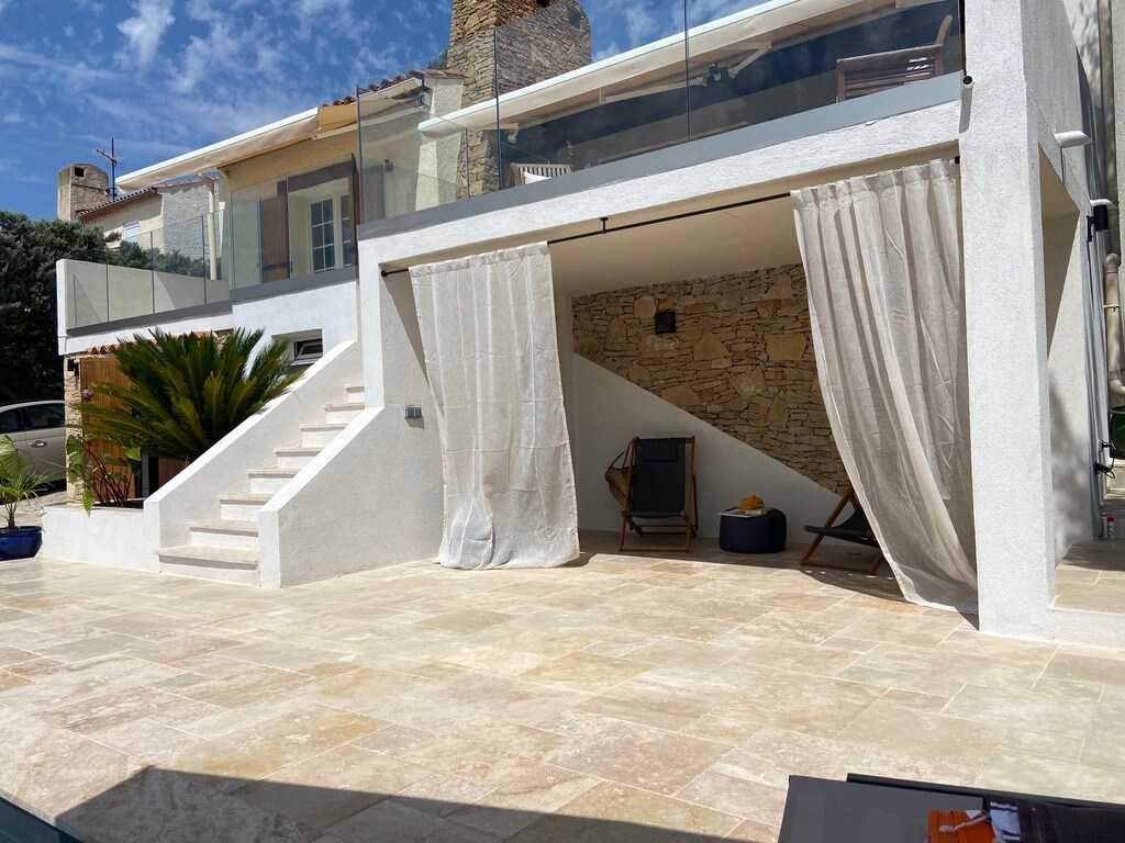 Jolie maison vue mer totalement rénovée, dans quartier tranquille. Aménagée avec goût pour un séjour détente et confort.Garanti... Superbe terrasse avec vue sur mer, à 5 minutes à pied de la plage, 2 minutes à pied des tennis, 2 minutes à pied glacier restaurant, à 2 minutes à pied centre esthétique et coiffure. 15 minutes à pied du centre-village et port. Longues balades sur la corniche de 4 km à 200 m de la maison. Linge de maison fourni (draps, serviettes, torchons) ménage inclus