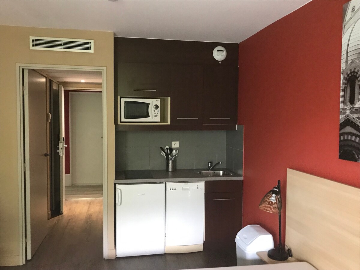 Muy bonito estudio de 20 m2 para 2 personas con terraza con todas las comodidades. Residencia de turismo con guarda (7/7 y 24/24) y cámaras de vigilancia. Ubicación ideal en el corazón del elegante barrio del Prado a 100 metros, de las playas más bonitas de Marsella y cerca de todos los servicios (tiendas, farmacia, restaurantes playas) y de accesibilidad (autobús, metro) = piscina exterior = aire acondicionado = se proporcionan sábanas y toallas = cocina equipada funcional = Proximidad al velódromo, a las playas, a las Calanques y al Parc Chanot.