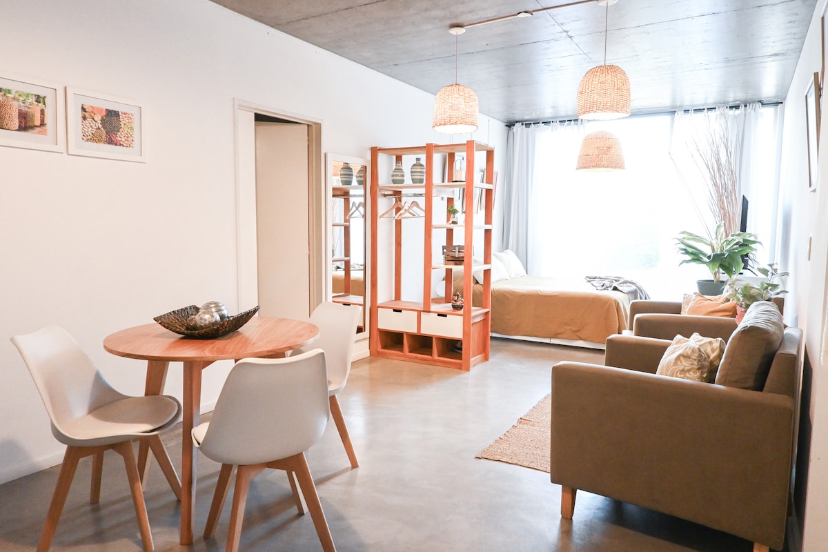 Relájate en este espacio tranquilo y elegante. El area de dormitorio ofrece la posibilidad de tener 2 camas individuales o una cama Queen. En la sala el sofá de transforma en una cómoda cama. La cocina tiene todos los elementos necesarios para preparar tus comidas. El departamento se encuentra cerca de muchos medios de transporte y accesos rápidos. El barrio tiene una bohemia propia, variados lugares para comer, podes hacer caminatas hasta la costa del río, recorriendo sus bellas calles