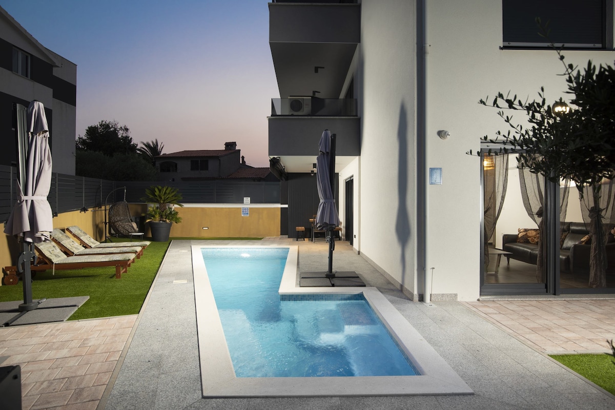 Capacidad 2+2, tamaño 42 m2, con un gran patio vallado y una piscina. Situado en la planta baja en una casa familiar en una calle tranquila; recién construido y totalmente equipado y amueblado. La casa está rodeada de árboles y ofrece una vista despejada al mar. No se admiten mascotas ni se puede fumar en el apartamento. Es accesible para personas con discapacidad. Piscina climatizada (mayo-octubre) : 8x4m, profundidad 1,5m. TV satelital, WiFi, aire acondicionado, caja fuerte, estacionamiento, chimenea/parrilla, terraza, terraza, tumbonas y una sombrilla junto a la piscina.