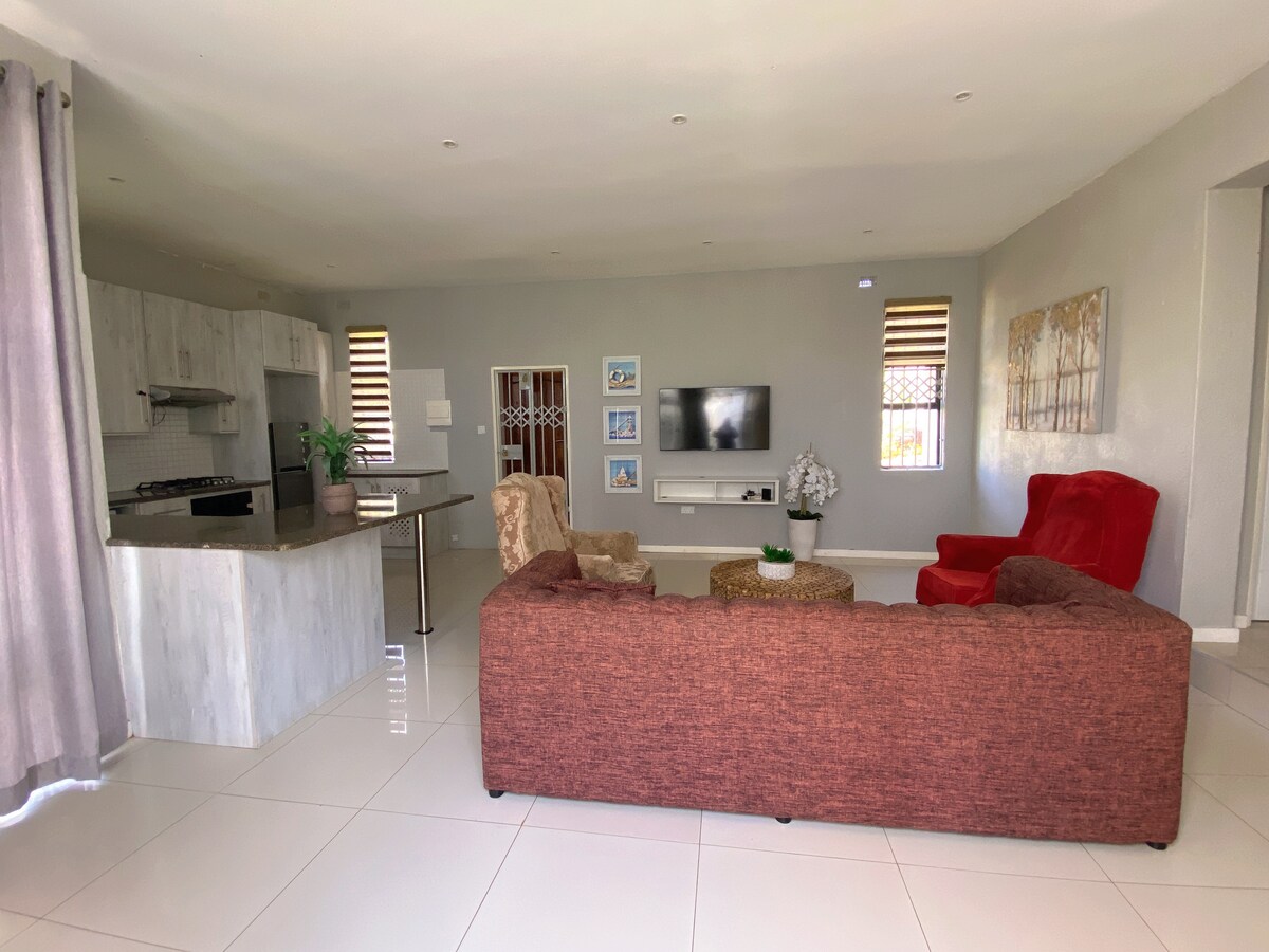 Una elegante casa de campo de un dormitorio (baño en suite). Cocina, comedor y sala de estar de planta abierta. Bonito patio con pequeño jardín privado. Ubicado en el centro de Newlands. A 5 minutos a pie del centro comercial. Ubicado en un exuberante jardín con acceso a la piscina. La cocina está totalmente equipada para cocinar. Baño nuevo. Servicio diario. ¡Wifi rápido e ilimitado! Inversión masiva en energía solar y sistema inversor de 5 kVA para mantener las luces, wifi, TV y neveras funcionando las 24 horas, los 7 días de la semana. Gran generador de respaldo.