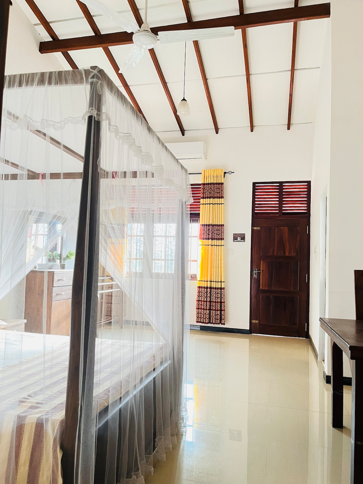 A very spacious room with a mezzanine bed and a large living area downstairs. The room has a private kitchen and shower in the backyard outside space. A/C, fan, hot water, mosquito net and a good wifi for a comfortable stay. Additionally, you could enjoy some coconuts from our garden and a quietness of a village, while still being within 15min ride from Weligama beach area.