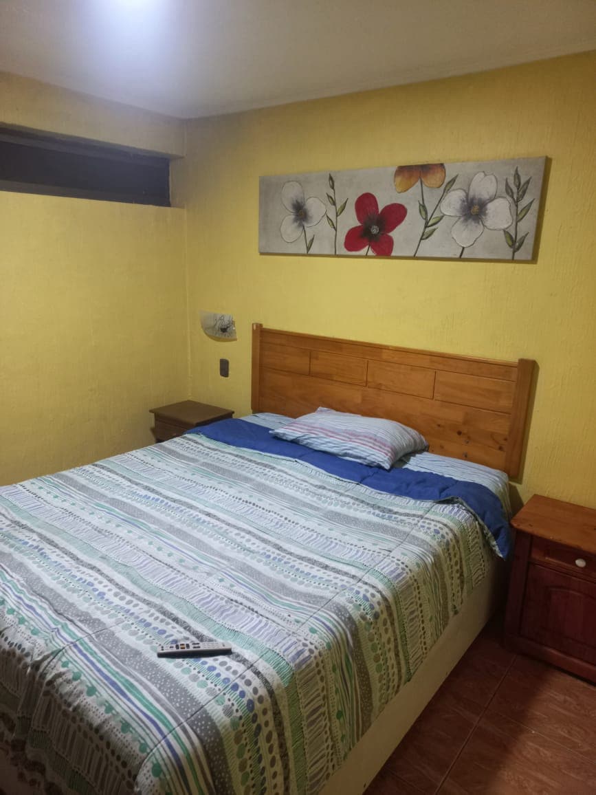 Departamento independiente en segundo piso, con las comodidades basicas, completamente amoblado y equipado. Es un espacio sencillo sin grandes lujos ideal para viajeros que valoren la tranquilidad y seguridad del barrio. Alejado del centro, con buena locomoción, accesos y locales comerciales, lugar muy tranquilo. Estacionamiento para un automóvil estándar. Estufa eléctrica en invierno y ventilador en verano.