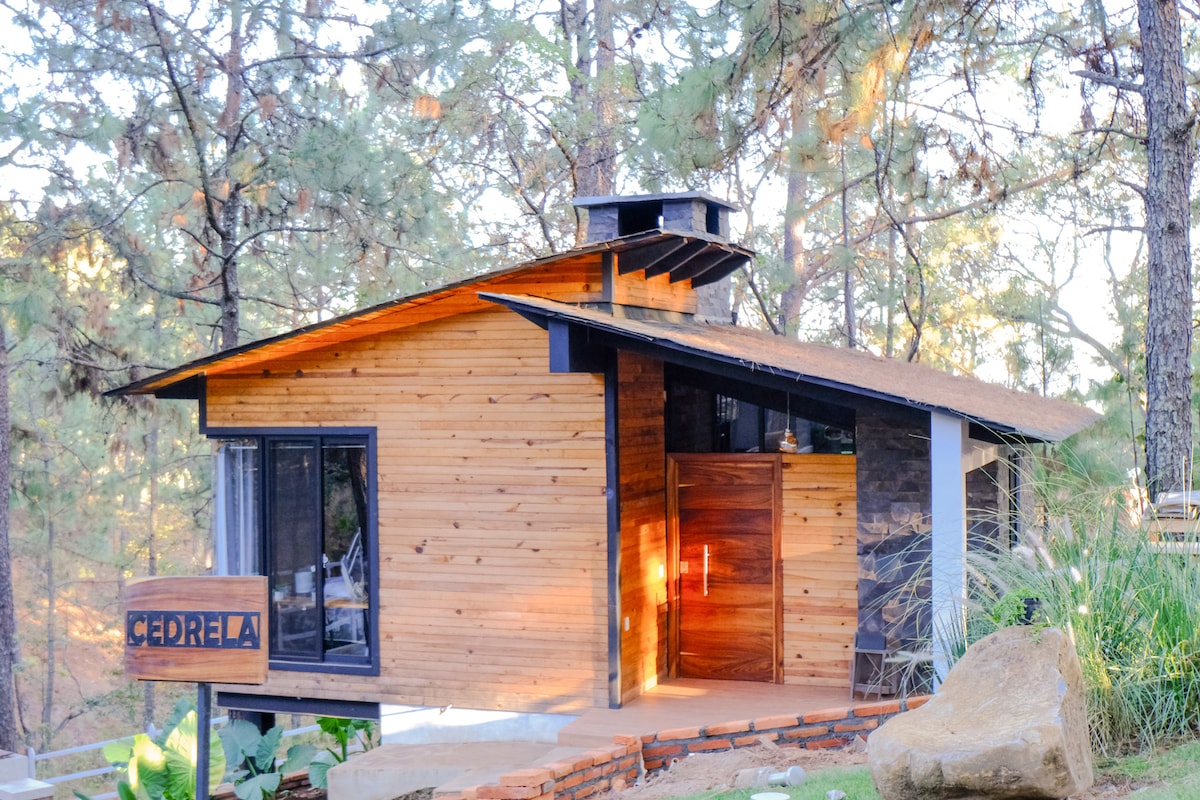 Cabaña tipo Chalet en madera interior y exterior, bellamente decorada, grandes áreas verdes privadas, vistas panorámicas, diversidad de plantas, iluminación de ambientación.