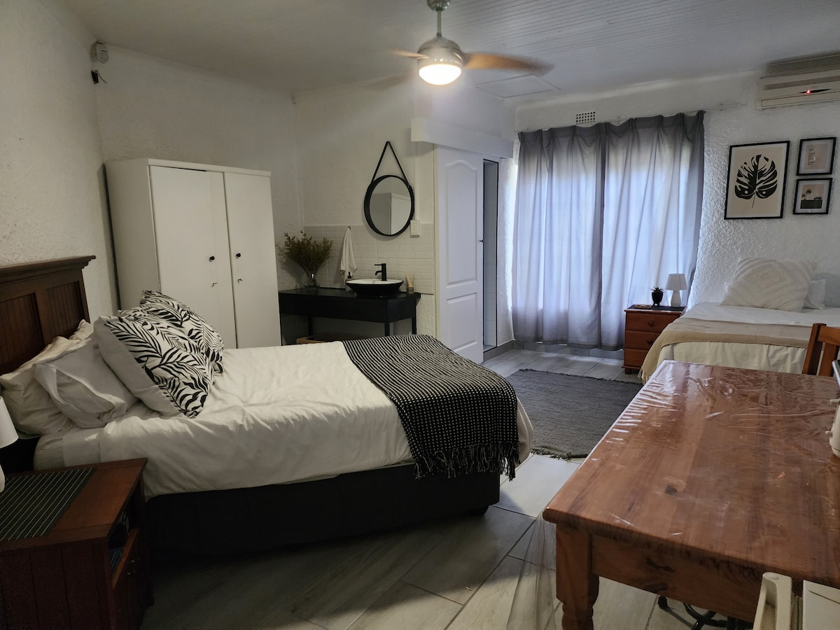 Disfruta de nuestra hermosa casa de campo con jardín con entrada privada. Esta unidad independiente con planta abierta, cocina completa y sala de estar, un dormitorio que sería ideal para un viajero solitario con tal vez un bebé, y un baño con ducha y bañera para bebés. Piscina, TV, Wi-Fi, estacionamiento para un vehículo, energía solar. Para nuestra clientela de negocios, este es un hogar privado ideal, lejos de casa, donde puedes atenderte a ti mismo o cerrar e ir. ¡El aeropuerto KMIA y Nelspruit están a 20 minutos!