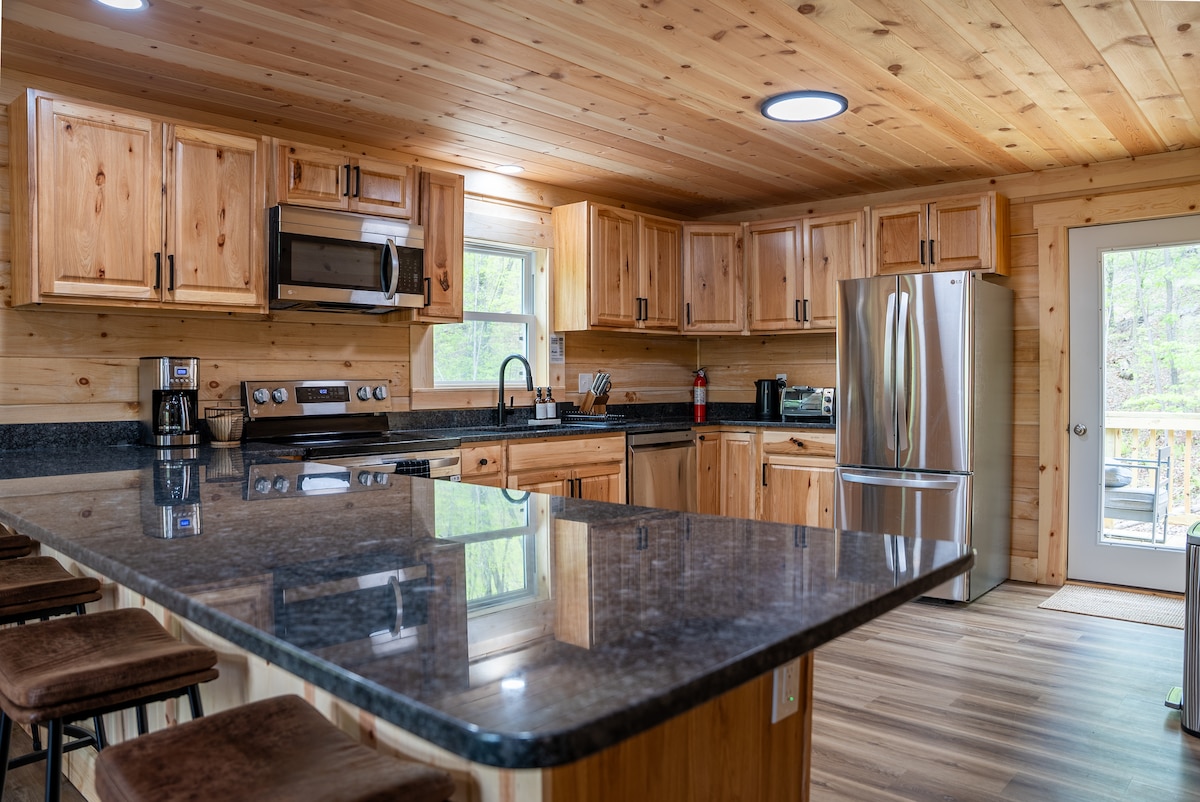 Escápate a Blue Ridge Mountain Lodge, donde la relajación y la aventura se encuentran. Ubicado en el corazón de las montañas, este refugio 4BR|2BA ofrece impresionantes vistas desde la terraza. Reúnete alrededor de la chimenea para disfrutar de s'mores, sumérgete en el jacuzzi o rejuvenece en la sauna. Un impresionante mural de 30 pies para fotos memorables, mientras que la sala de juegos promete horas de diversión para todos. Experimenta la mezcla perfecta de relajación y emoción en esta escapada inolvidable. Se requiere 4x4 en condiciones nevadas/heladas.