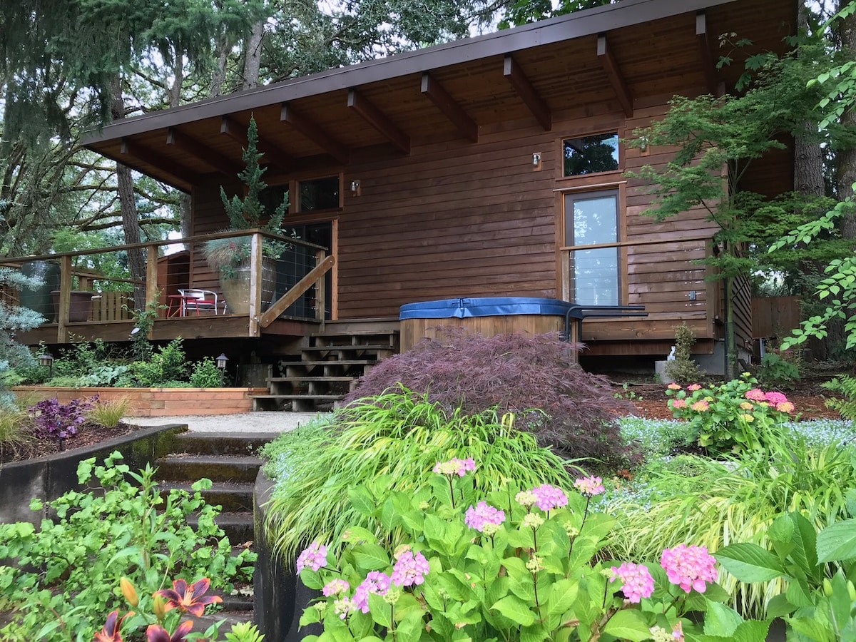 Architecturally designed backyard cottage located one mile south of the University of Oregon adjacent to Eugene's historic Masonic Cemetery. This contemporary Northwest space includes a spacious living area with a new king-sized bed, smart TV, WiFi, kitchen, bathroom, private sauna and hot tub, and a spacious deck to enjoy beautiful sunsets. Located within walking distance to the University, coffee shops, Amazon Pool, and neighborhood stores. Enjoy dedicated parking and a beautiful setting.
