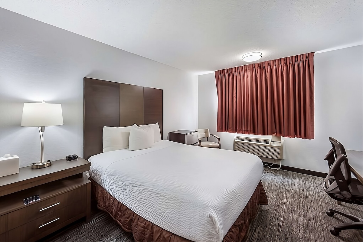Looking for a simple, comfortable place to stay in Medford? Our King Room offers the convenience travelers appreciate—ground-floor access with parking right outside your door. The room features a comfortable king bed and a relaxing recliner, perfect for unwinding after a long day. Located just minutes from I-5, downtown Medford, and the airport, it’s an easy stop whether you're visiting the Rogue Valley, traveling for work, or passing through Southern Oregon. Clean, comfortable, and welcoming.