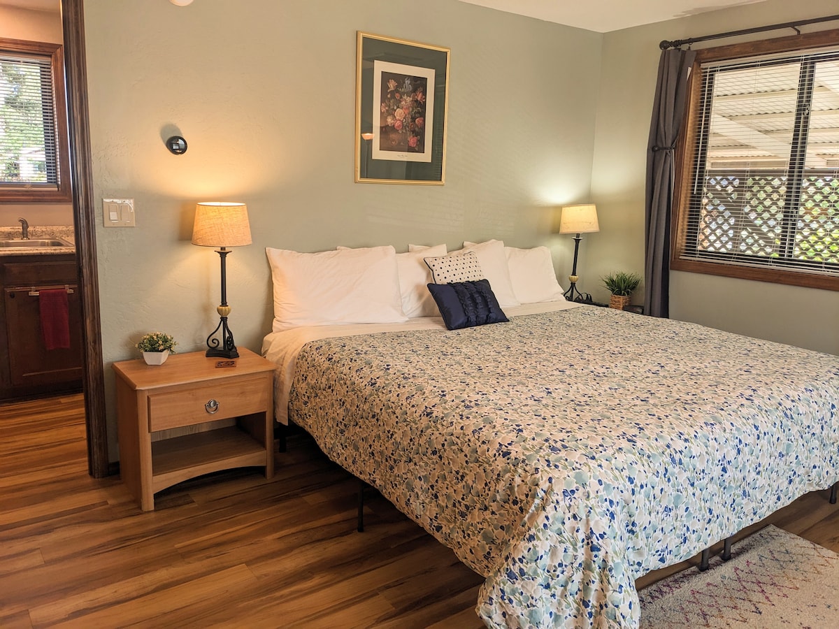 Escápate a esta encantadora casa DE campo privada con su propia entrada y cómodo estacionamiento. Este acogedor refugio incluye una mininevera, microondas, Keurig, wifi rápido y TV con Netflix. La decoración relajante, el baño personalizado y la ducha estilo spa lo convierten en una escapada relajante. Ubicada a 3 millas del centro histórico Grants Pass en el hermoso campo agrícola de Oregón, la propiedad cuenta con un tranquilo estanque lleno de aves en primavera y verano. Relájate y disfruta de la mezcla perfecta de comodidad y naturaleza.