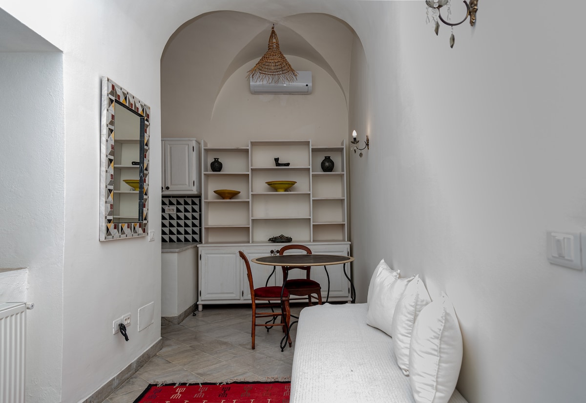 Mr. Bortman is perfect for writers, researchers or long term business travellers. It has a large bedroom with small office, and living area, with cosy dining/working table, kitchenette and a bathroom with shower. Mr. Bortman is well hidden, within Dar Ben Gacem -Kahia-, an 18th century Dar which was converted into a boutique hotel. Hence Bortman residence, could benefit from all guesthouse services, upon request. Walking distance to any downtown Tunis location.