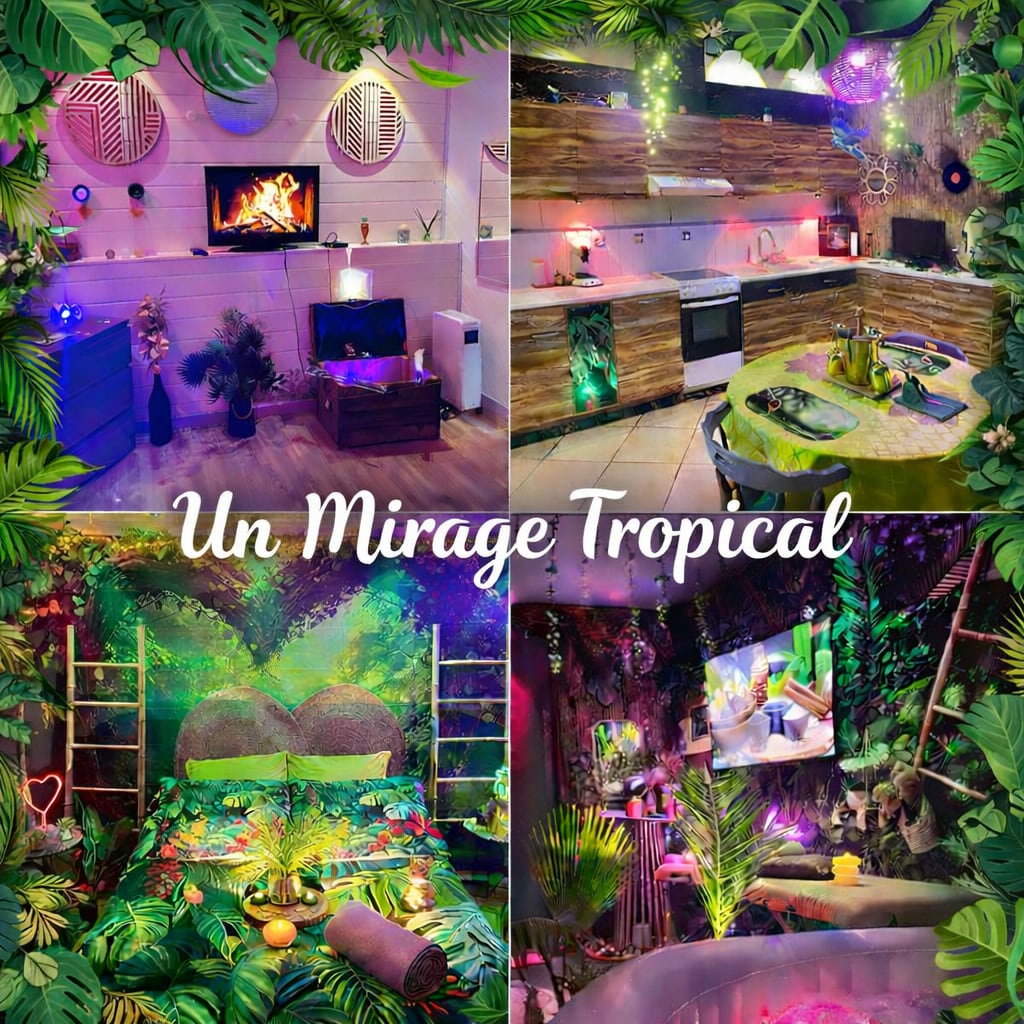 ✨ Découvrez le Mirage Tropical , une parenthèse raffinée au bord de la Loire 🌴. Profitez d’un Spa , Table de Massage d’une terrasse élégante et d’un espace jungle dépaysant pour vous évader. Amusez-vous autour du jeu de fléchettes, partagez un apéro exotique ou détendez-vous dans une atmosphère unique. Le soir venu, la chambre s’illumine de couleurs envoûtantes pour un moment chic et romantique 💖. Ici, chaque détail sublime votre séjour pour créer des souvenirs mémorables.🌴❤️❤️💕💕💕👄🫂❤️