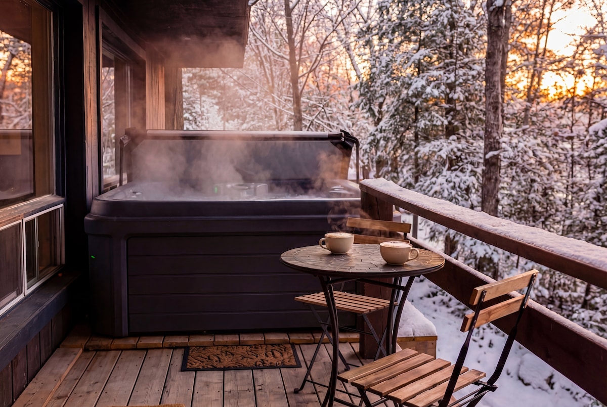 PISCINA y JACUZZI cerrados hasta junio de 2026 Bienvenido a Le PanoramiK, un impresionante alquiler en esquina ubicado en el corazón del pueblo de Mont-Tremblant Old. Esta cabaña de diseño cuenta con una belleza natural y comodidades modernas para que todos los huéspedes disfruten. - A 5 minutos en coche de la estación de esquí de Mont-Tremblant. - Parada de transporte gratuito cerca. - Aparcamiento gratuito/Wifi. - Netflix/video principal (se requiere suscripción propia) - Balcón privado con mesa de comedor. - Laudromat compartida en el sótano ($)