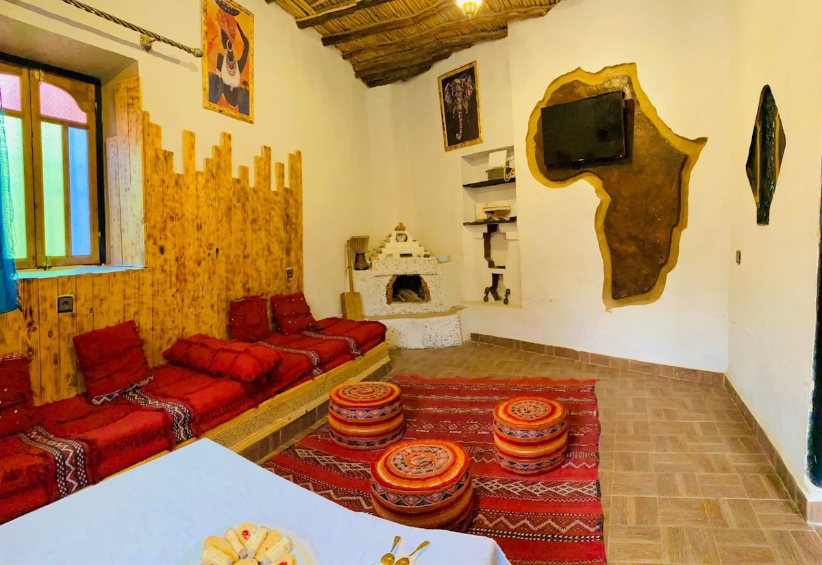 Es un apartamento construido a mano donde vive mi familia desde 1958. WIFI gratuito, televisores inteligentes, lavadora, estacionamiento gratuito, cocina bien equipada con licuadora, cafetera, estufa y más. Una unidad de aire acondicionado en la sala de estar. A tres minutos de las hermosas dunas de arena y del centro de Merzouga. La calle es la más limpia y tiene sus encantos antiguos. Relájate en este espacio tranquilo y elegante.