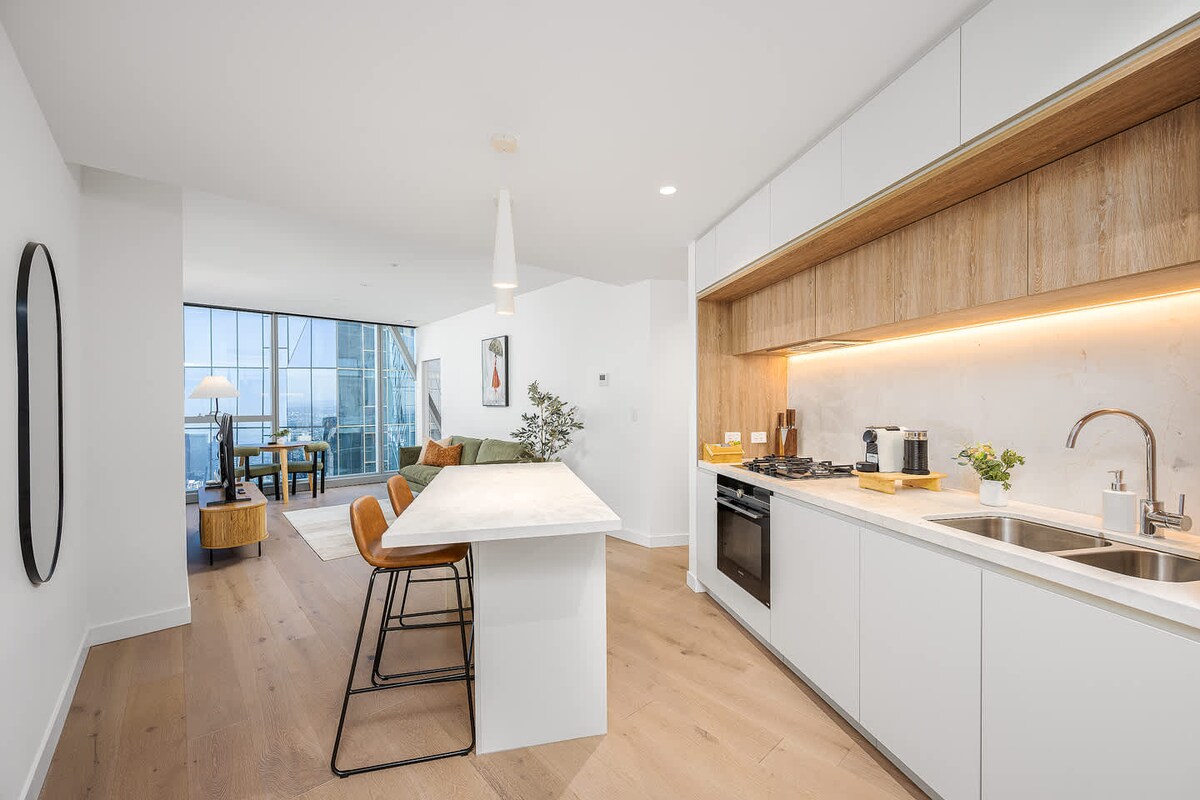 En el corazón del centro de la ciudad de Melbourne. Moderno y elegante apartamento de 2 dormitorios/2 baños (2 duchas de monzón y jacuzzi privado de estilo japonés). Apartamento estilo resort en el subático del piso 53 en el edificio más emblemático de Melbourne, con vistas al horizonte de la ciudad de Melbourne con infinitas vistas panorámicas del horizonte. Aparcamiento seguro, wifi de alta velocidad ilimitado, TV por cable, piscina, gimnasios, saunas, spa, barbacoa, lavadora/secadora, cocina con electrodomésticos de acero inoxidable y encimeras de piedra e isla de cocina, cafeteras Nespresso y baristas, 3 televisores.