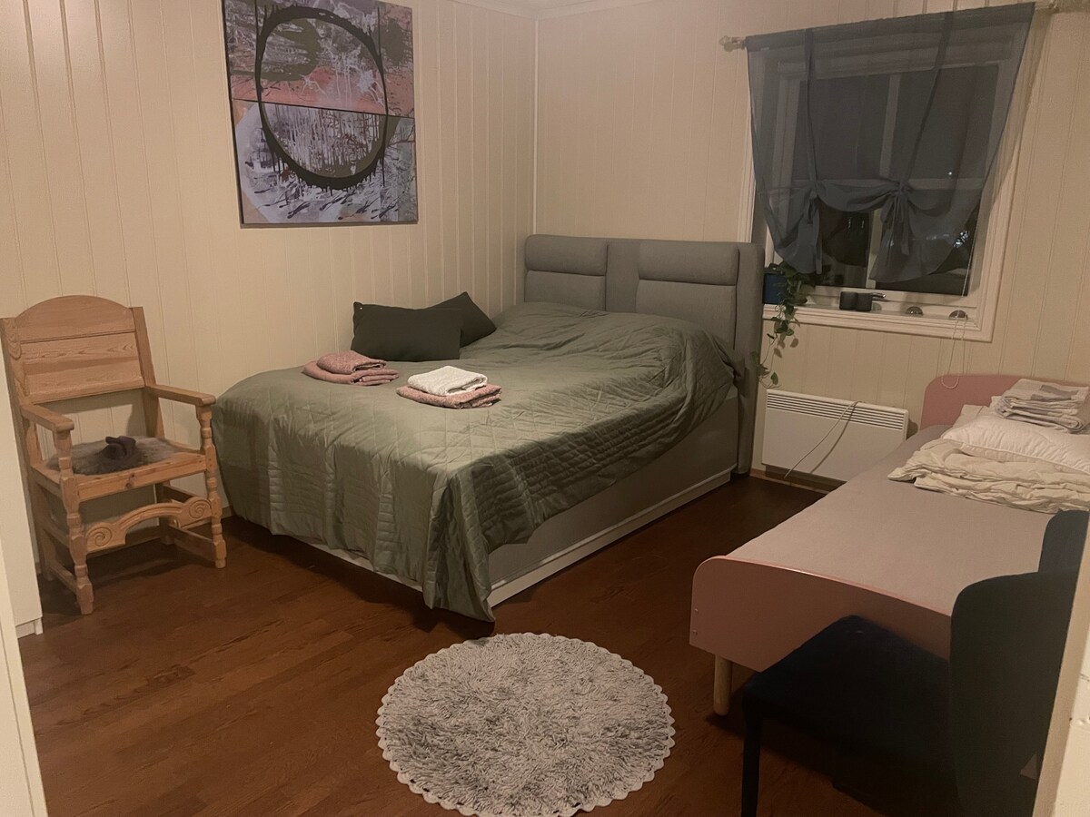 Romslig og rolig leilighet (215 m²) i tradisjonell trønderlån på Lundamo, ca. 8 min fra E6 og 30 min fra Trondheim. Leies kun ut til én gruppe. Inkludert: 1 soverom (2 senger), eget bad, kjøkken, oppredde senger, håndklær og gratis parkering. Flere soverom kan åpnes mot tillegg, ubrukte rom holdes avlåst. Perfekt for gjennomreise, arbeid eller et stille opphold.