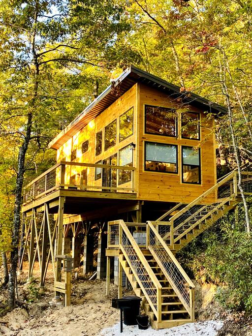 Cerca de todas las aventuras de Red River Gorge. Convenientemente ubicado a pocos kilómetros de Slade y Stanton. La habitación principal incluye un sofá cama que se convierte en una cama, una cocina, Keurig, microondas, nevera, placa de cocción y minihorno para tu comodidad. Una mesa incorporada con taburetes, TV y chimenea eléctrica. Arriba de la hermosa escalera de madera hay un loft con un pequeño escritorio, cama tamaño queen y un balcón con vista a la montaña. También disfruta de la bañera de hidromasaje privada.