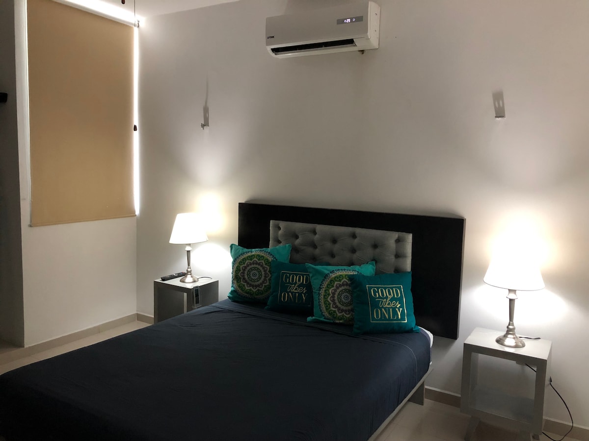 Amplio y cómodo departamento con servicios que te harán sentir como en casa. Está ubicado en una zona muy tranquila que se encuentra a unos pasos del centro de convenciones, restaurantes, bares, plazas comerciales y un supermercado selecto enfrente para que puedas hacer tus compras. Cuenta con cocina equipada, aire acondicionado en las 3 recamaras, TV con fire stick y el WIFI es de 150 Mbps. Tiene un lugar de estacionamiento. El área de sala y comedor solo cuenta con ventiladores no tiene A/C