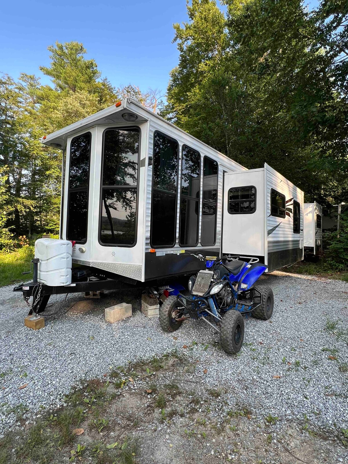 Alójate en el camping Suncook River en una de nuestras caravanas recientemente remodeladas. Disfruta de todos los servicios del camping como piscina enterrada, dos playas fluviales, kayaks y canoas rentables, tienda de campamentos, instalaciones de baños completos, además de todo lo que tu propia caravana privada tiene para ofrecer. Esta unidad remodelada tiene colchones nuevos y mucho espacio. Cocina completa, baño privado y mesa de comedor convertible/cama supletoria para el niño. ¡Estacionamos nuestras caravanas rentables justo en el río!