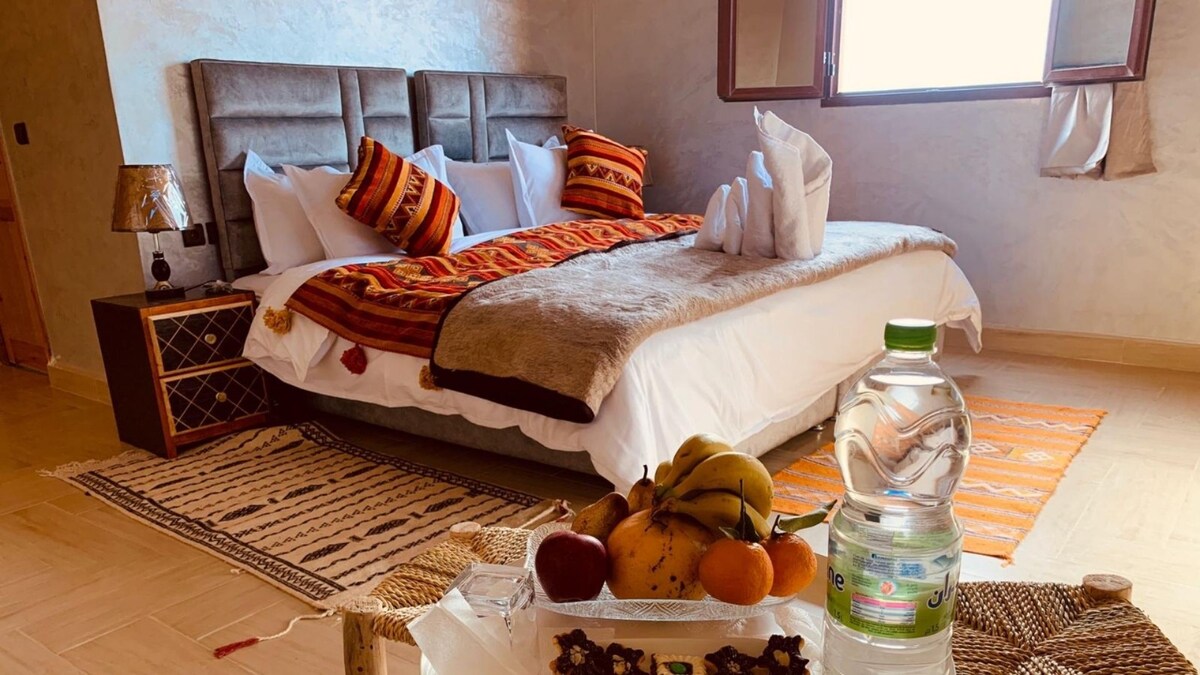 Escápate al desierto, un oasis cautivador en el corazón del desierto de Merzouga. Nuestro encantador y elegante hotel ofrece una experiencia de primer nivel, combinando tranquilidad con actividades emocionantes. Empápate del ambiente sereno de nuestra ubicación céntrica, rodeada de impresionantes paisajes desérticos. Descubre la magia de los paseos en camello, explora las encantadoras dunas y contempla las estrellas bajo el cielo despejado del desierto. Con amplias habitaciones con capacidad para cuatro huéspedes, nuestros alojamientos ofrecen comodidad y rejuvenecimiento.