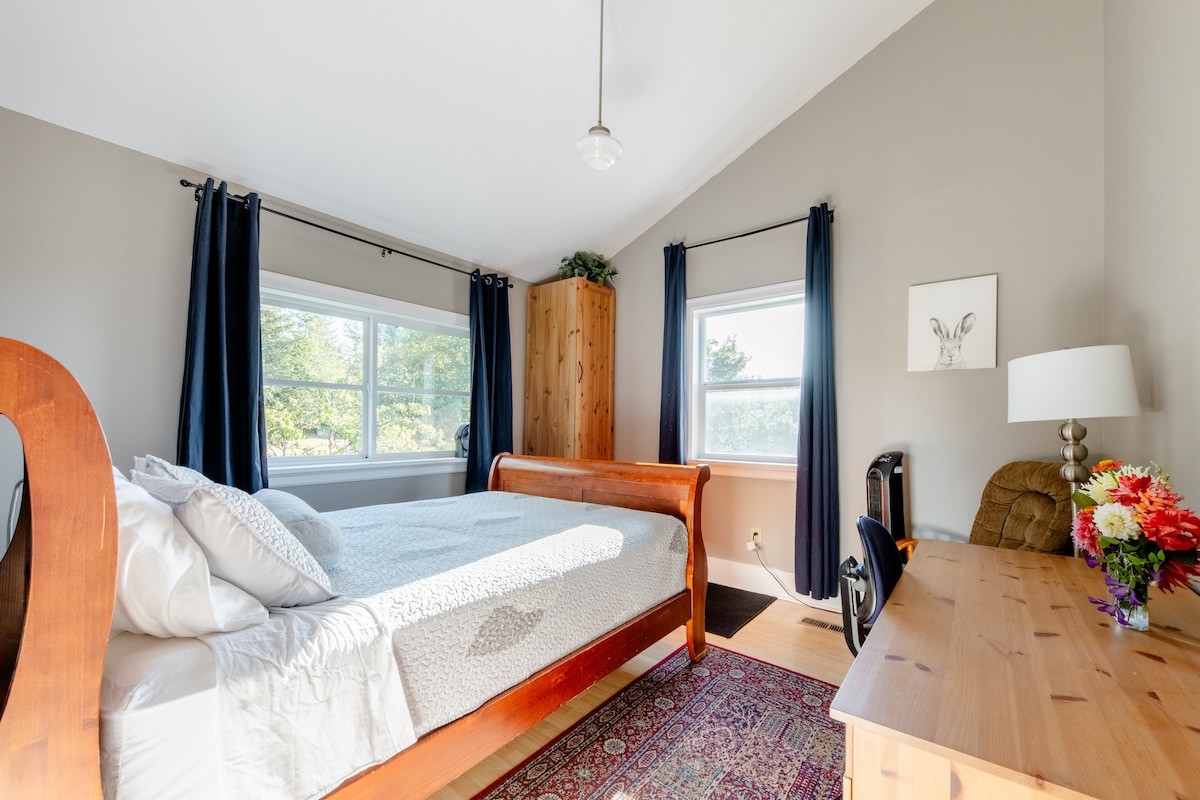 Discover tranquility in our heritage farm retreat, nestled on acreage with 2 dogs , 2 cats , chickens/ roosters & a pond with fish to sit by under the apple tree. There’s a big colorful garden, art fence by our own fir forest. Located close to sunset beaches and Gibsons for supplies. Note: Suite is cozy, with 6'8" ceilings and 6' max shower & kitchenette. Enjoy meals by pond or patio, complimentary farm-fresh eggs, and breakfast supplies. Book your furry & feathered friends stay today 💛