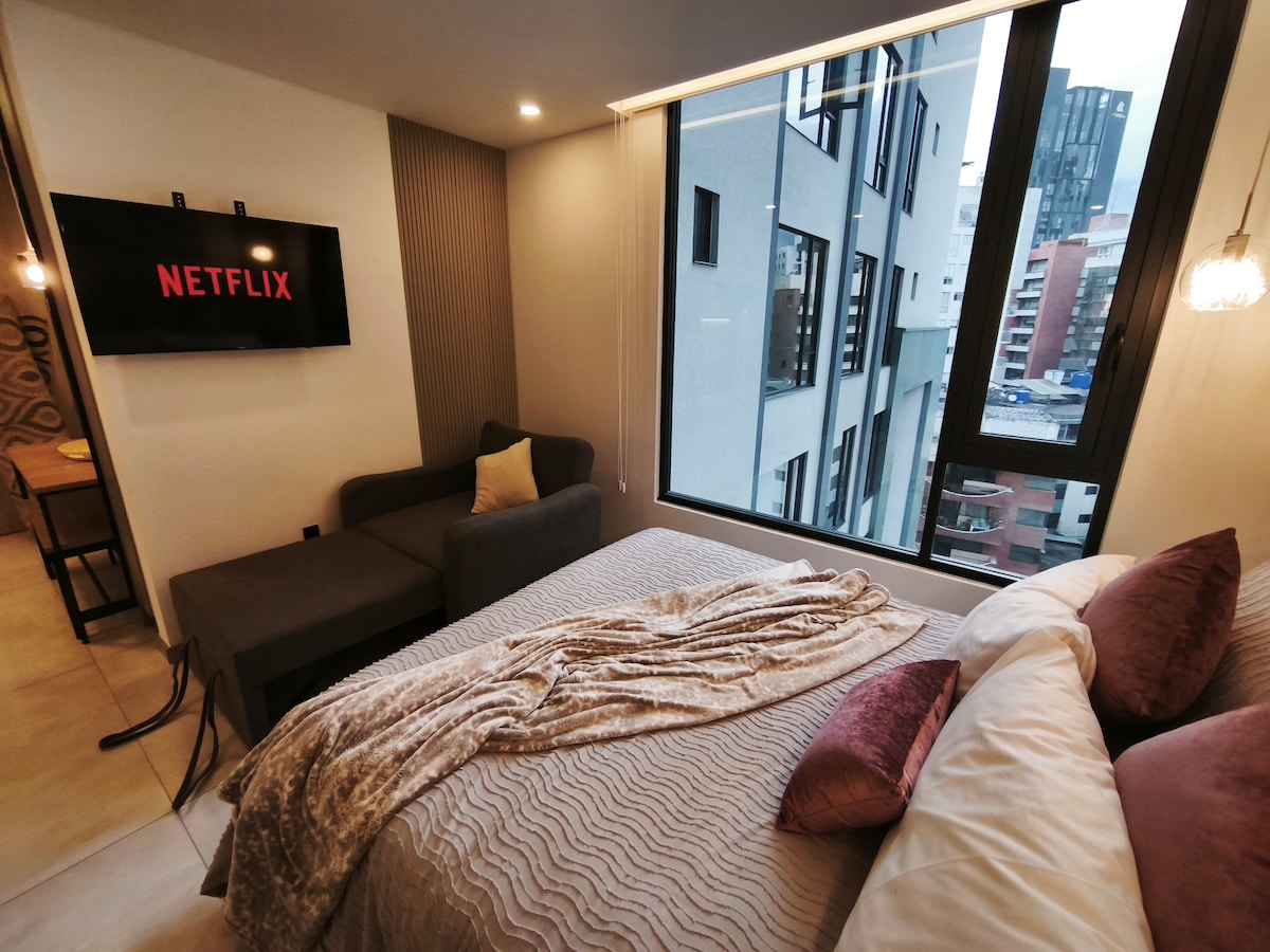 Disfruta de facil acceso a transpote, gracias a la proximidad de una parada de metro, a tan solo 5 min. Nos aseguramos que tengas todo lo que necesitas, como si estuvieras en casa. Disfruta de una taza de café orgánico después de una noche de descanso. A tu disposición internet de alta velocidad. TV con acceso a:Netflix-HBO Ubicación céntrica, encuentras restaurantes, con variedad de actividades. Terraza con hermosa vista del Pichincha. Estacionamiento privado. Agua caliente. Guardiania 24h.