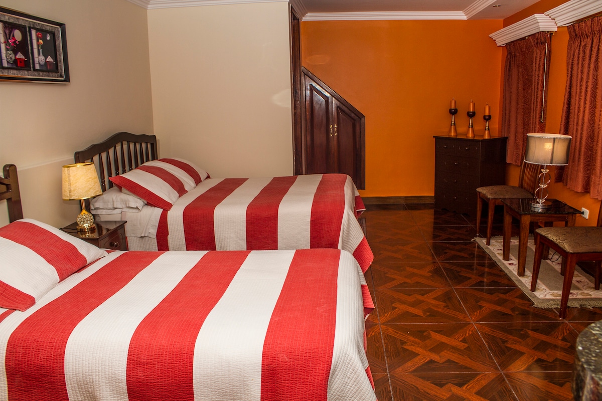 Habitación con dos camas grandes con baño privado, acabados de lujo. Recepción 24 horas Incluimos desayuno Wifi, cocina compartida, área de Parrilla, amplios jardines . Podemos organizar tu recogida del Aeropuerto y Tours con taxis de nuestra confianza.