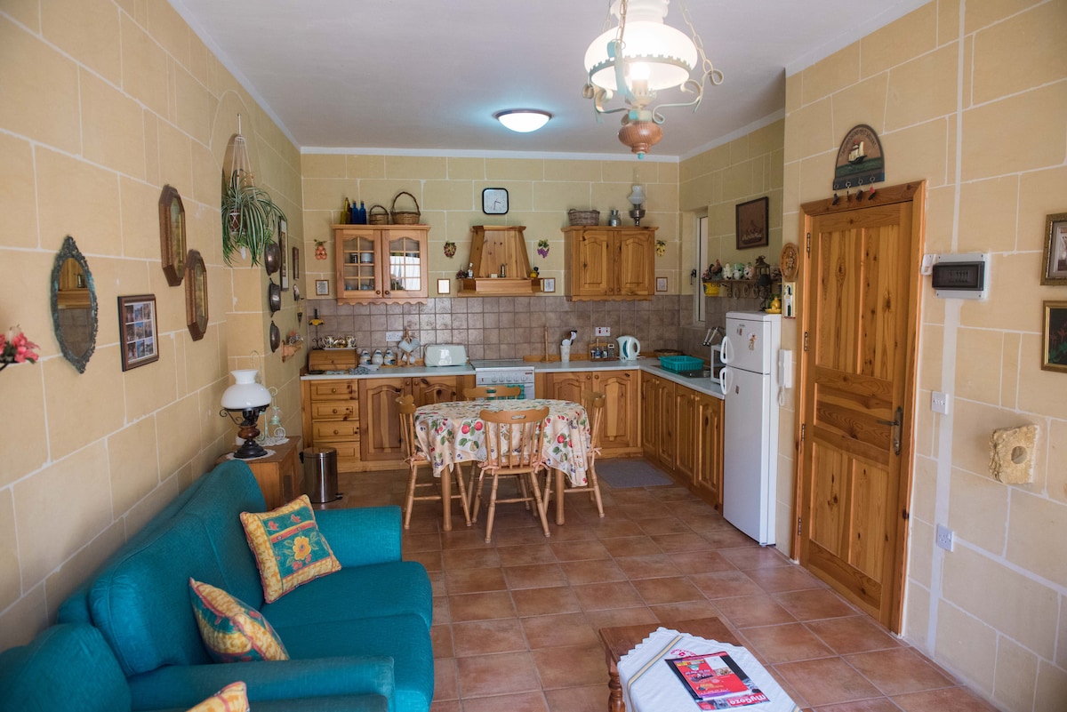 This is a refurbished, one-storey character house. It consists of a large kitchen-living room, 1 main bedroom, 1 small spare bedroom with bunk beds, a shower-bathroom & a yard. It has beautiful country views and is only minutes away from Gnejna bay & Golden Bay. Grocers, pharmacy and buses are at walking distance. Kitchen and main bedroom have air-conditioning. Spare bedroom has a wall fan. Bathroom has a wall heater. We can provide cot & high chair on request.