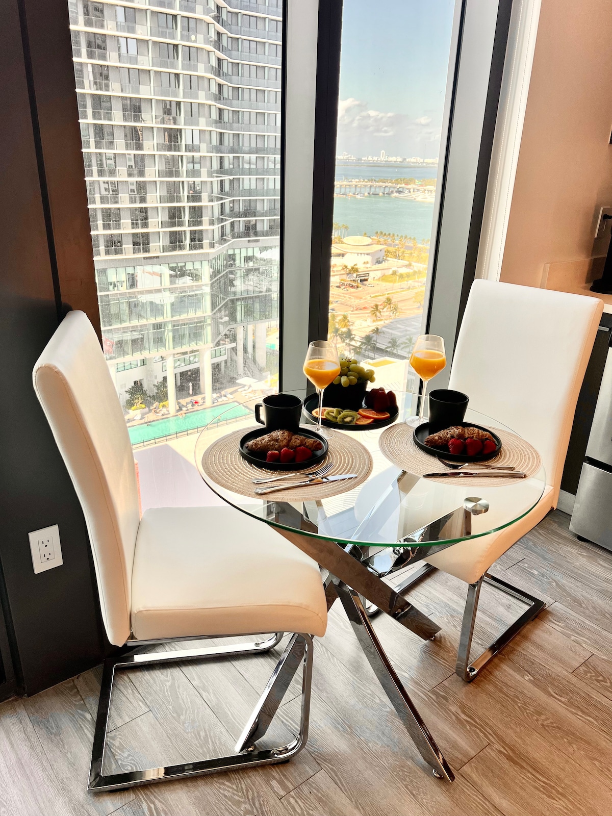 La mejor ubicación en Miami Downtown, con una vista única de la bahía y la Ciudad. Amplio y con detalles de alta calidad. El departamento cuenta con amplios espacios, sala con un amplio sofá, cama queen. También cuenta con smart tv e internet, y también se ofrece café en cápsulas, té, algunas botellas de agua y otros detalles de calidad. Acceso de invitados área de parrilla y entretenimiento piscina, sector de reuniones y trabajo en línea, diferentes oficinas y un gimnasio totalmente equipado.