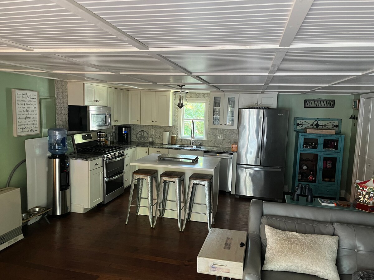 Escrupulosamente decorada con auténticos clásicos de mediados de siglo mezclados con detalles rústicos. Privacidad total garantizada, sin cámaras ocultas, casa de campo de 600 pies cuadrados con terraza privada, amueblada y cubierta y un jardín privado vallado y amueblado con un pozo de fuego de piedra natural y acceso a la playa privada. Internet de alta velocidad, 500 Mbps, aire acondicionado frío, pequeña cocina equipada para cocina básica y mínima. Relájate en las sillas Adirondack, haz una parrilla junto a la chimenea o cena al aire libre en el jardín. Aparcamiento para 2 coches.