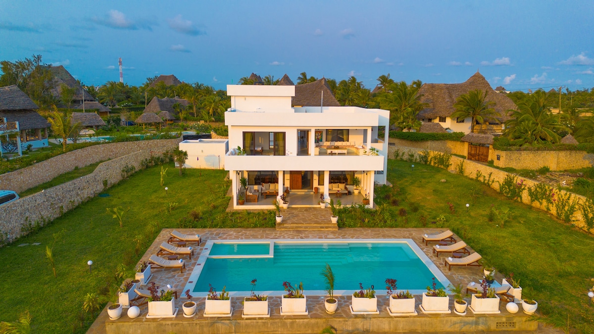 CHEF, AMA DE LLAVES Y SERVICIO DE LIMPIEZA INCLUIDOS Exclusiva villa con personal dedicado, rodeada de vegetación a solo 400 metros del mar de Kenia y el arrecife de coral. Distribuido en dos pisos, cuenta con una piscina con solárium, tumbonas y un cenador para cenar al aire libre. 3 amplios dormitorios tamaño king, mosquiteros, baños privados, ventiladores y armarios. Cocina totalmente equipada, estacionamiento y autosuficiencia en agua, electricidad y gas. El personal cálido y profesional garantiza una estancia inolvidable.