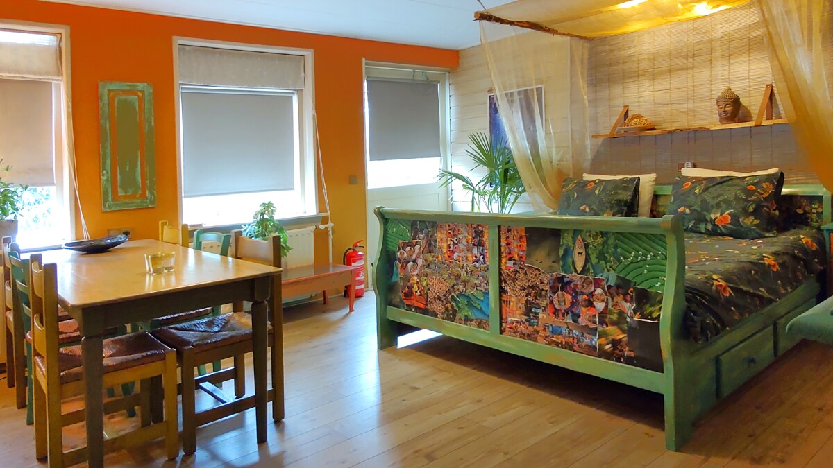 Estancia atmosférica y colorida, inspirada en el esplendor de la India para aquellos que desean algo diferente a los estándares. Los precios incluyen la tasa turística Con desayuno también es posible por € 11.00 p.p.d. Total de 48 m2 Parte de mini camping y glamping Outside World Situado en la planta baja, se admiten mascotas, se admiten sillas de ruedas La estadía tiene un nuevo baño grande con inodoro, ducha y lavabo y cuenta con una entrada privada y un espacioso jardín orientado al sur.
