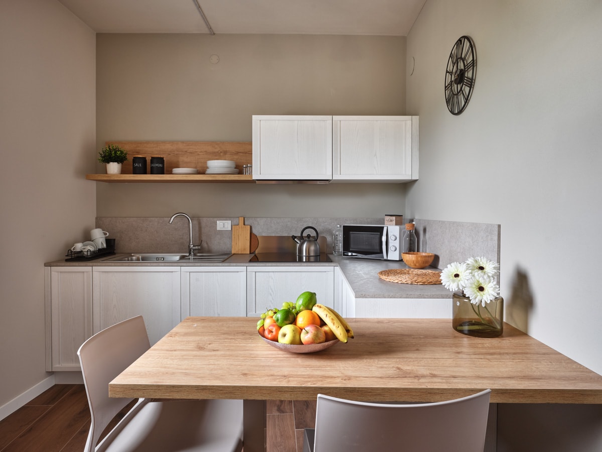 Un estudio muy luminoso y natural, con la sensación de pureza y bienestar, un bienestar interior que nos gustaría transmitirte. Un entorno adecuado para aquellos que quieren alojarse en espacios más cómodos y libres, sin preocupaciones y horarios porque tiene una cocina pequeña equipada con platos y electrodomésticos, para darte la oportunidad de almorzar y cenar en la habitación cuando quieras. También puedes alojar a personas con discapacidades de movilidad por su ubicación, accesorios y espacios.