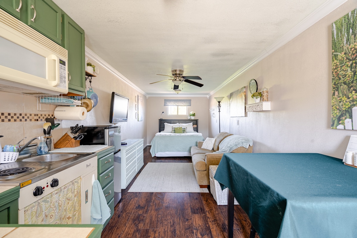 This cozy 250 sq ft studio apartment, with dedicated one-car garage space, is located in a quiet neighborhood near the Huachuca mountains. The space is on the second story above the garage of a single-family home. Its charming size is perfect for individuals and couples. The shower and bathroom are small (may be uncomfortable for people over 6 feet). Works well for military, contractors, traveling nurses, and bird watchers. Includes everything needed for a short or long-term stay.