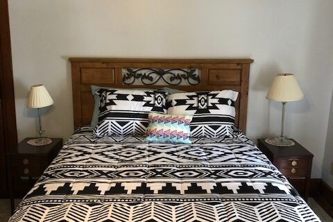 Amplia y cómoda suite adjunta con patio privado cerrado y entrada, bañera de hidromasaje para 2 personas, cama tamaño king con sábanas suaves, chimenea de gas, sala de estar con TV inteligente Roku y una exhibición única de juguetes antiguos. Todo lo que necesitas para disfrutar de una escapada acogedora. ¡Relájate en tu patio privado, en nuestra pérgola de jardín con vistas al estanque de la cascada o disfruta del centro de la ciudad a solo unos pasos de distancia! Se admiten perros hipoalergénicos por una tarifa de 50 USD. Por favor, lee las «Normas para mascotas».