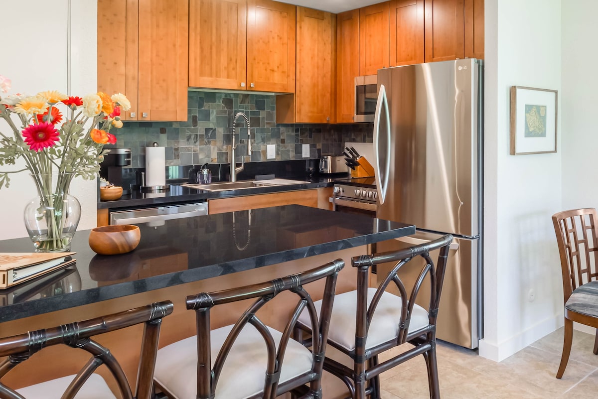 Relax in complete privacy at your newly renovated end-unit retreat, nestled among tropical greenery and filled with high-end touches. From the spa-style bathroom to the gourmet kitchen, every detail is designed for your comfort and care. Sip fresh espresso surrounded by original art from noted local artists, South Pacific antiques, and the cool air of a powerful split A/C. Modeled after 5-star Hawaiian resort bungalows, this peaceful hideaway invites you to unwind in quiet luxury.