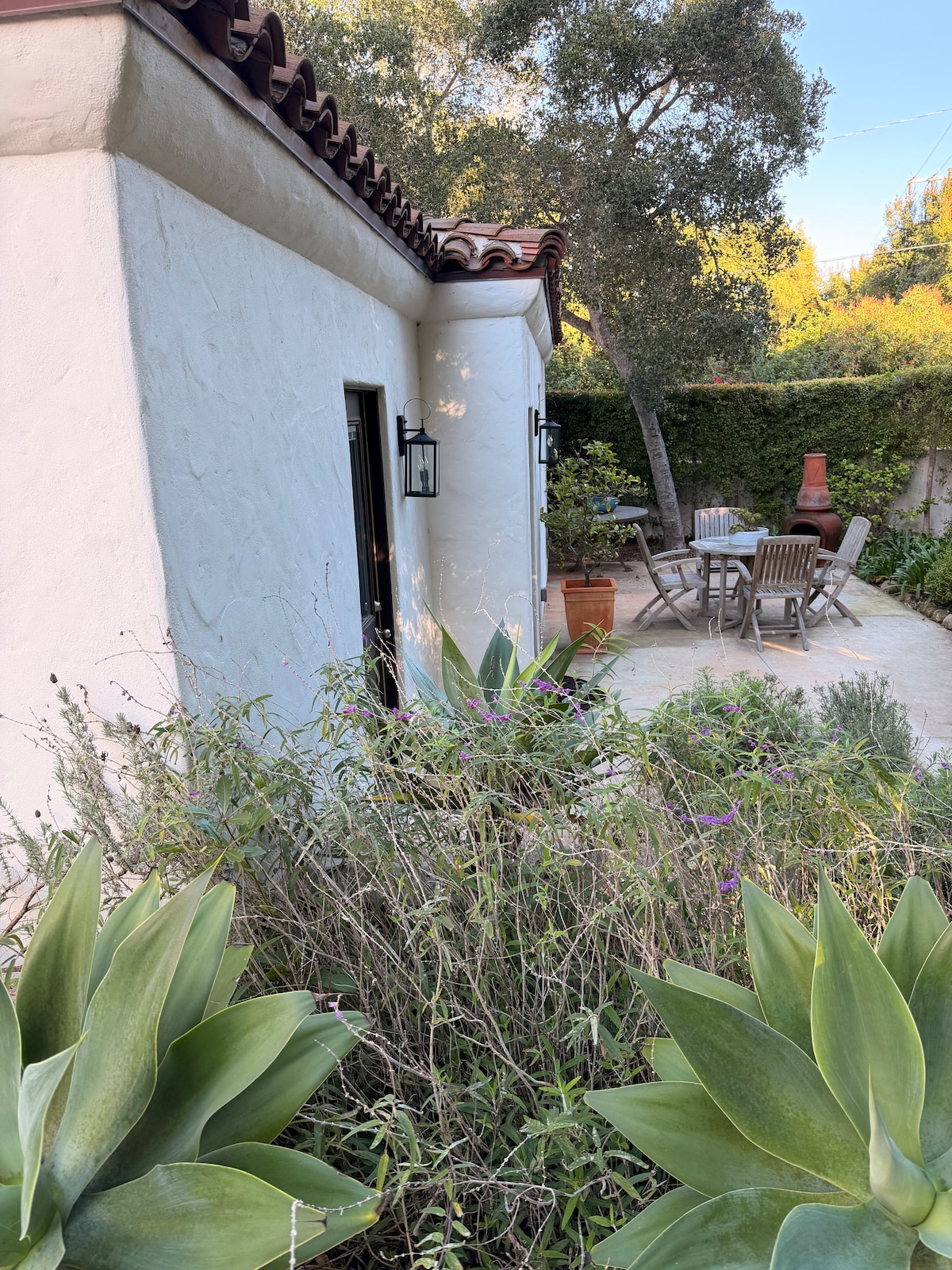 Our detached Spanish-style artist’s studio is within a 3 to 15 minute walk of all the best restaurants and shops in the lower Village of Montecito. It is an easy four block walk from the patio to beautiful Butterfly Beach. It is cozy, private and has a fabulous, hot, outside shower ! (Note; this shower is the only shower for the studio). Gaze at the stars while rinsing off the sand ! The studio space is small, and cozy, warm radiant concrete floors can be turned on in the chillier months.