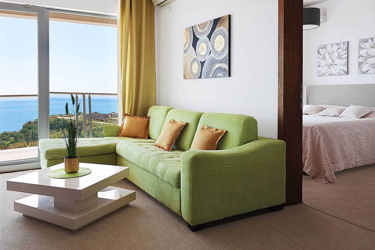El nuevo apartamento de 4 habitaciones con un moderno diseño interior se encuentra en el sexto piso y ofrece una vista panorámica única del mar Adriático. ¡Este apartamento totalmente amueblado cuenta con 3 dormitorios, 2,5 baños y ofrece gran comodidad y relajación para hasta 10 personas! Como huésped, tienes acceso gratuito a las piscinas, bares, saunas, jacuzzi y gimnasio. ¡Disfruta de una taza de café por la mañana en el balcón con una fantástica vista de la bahía de Becici y el mar prístino!