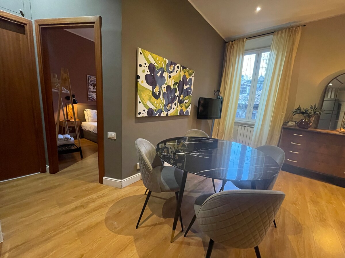 Precioso apartamento situado a 500 metros del Coliseo en pleno centro histórico, en el primer piso de un edificio de 1880, con techos de madera, elegante, refinado y equipado con una romántica terraza. Ideal para una pareja, ofrece la posibilidad de que otros dos chicos duerman en la sala de estar, donde hay un cómodo sofá cama. El alojamiento dispone de calefacción, televisión inteligente, wifi, lavadora, aire acondicionado y cocina completa con lavavajillas, hervidor, cafetera y microondas.