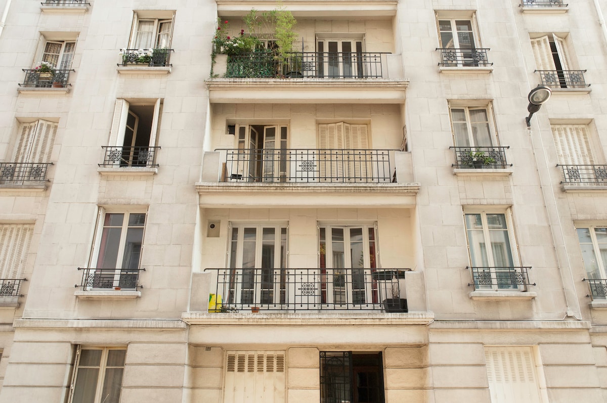 Quiet traditional Parisian apartment in a 19th Century dressed stone building and street on 5th floor with elevator : double living room, bedroom, fully equipped kitchen (dish washer and washing machine/dryer), balcony and private underground parkplace (4 minutes on foot). I furnished and decorated it with love, including paintings. In a neighbourhood vibrant of shops and restaurants, it is 2 minutes on foot from the Metro, from which all Paris must-sees are within a 13-30 minute range.
