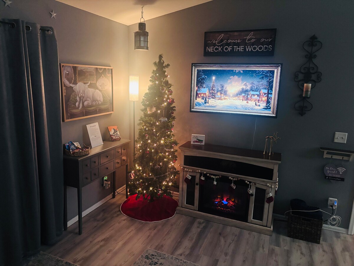 Apartamento privado para huéspedes en una tranquila calle sin salida cerca del centro de Montrose. Tres casas del cinturón verde entre parques establecidos. Cinco cuadras cortas en un sendero mantenido a pie/bicicleta a lo largo de Cedar Creek hasta la cervecería y la cafetería en Main. Fibra, Internet y TV fiables con Roku. Aparcamiento fuera de la calle. Los propietarios y su perro comparten con los huéspedes un patio vallado, una chimenea, una pérgola y una parrilla de gas. Se admiten perros de hasta 35 libras, negociable con una tarifa de 35 $ por perro y visita. Licencia de la ciudad de Montrose 013572/TTLHJA
