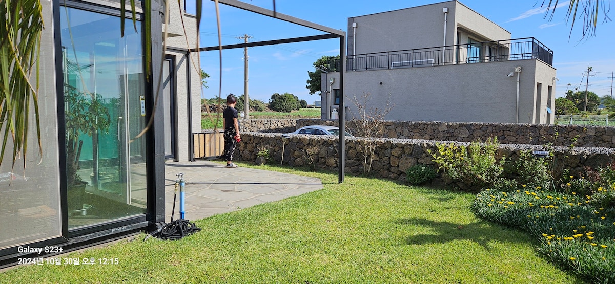 Es un alojamiento que tiene como patio delantero el misterioso mar de Jeju de color esmeralda.