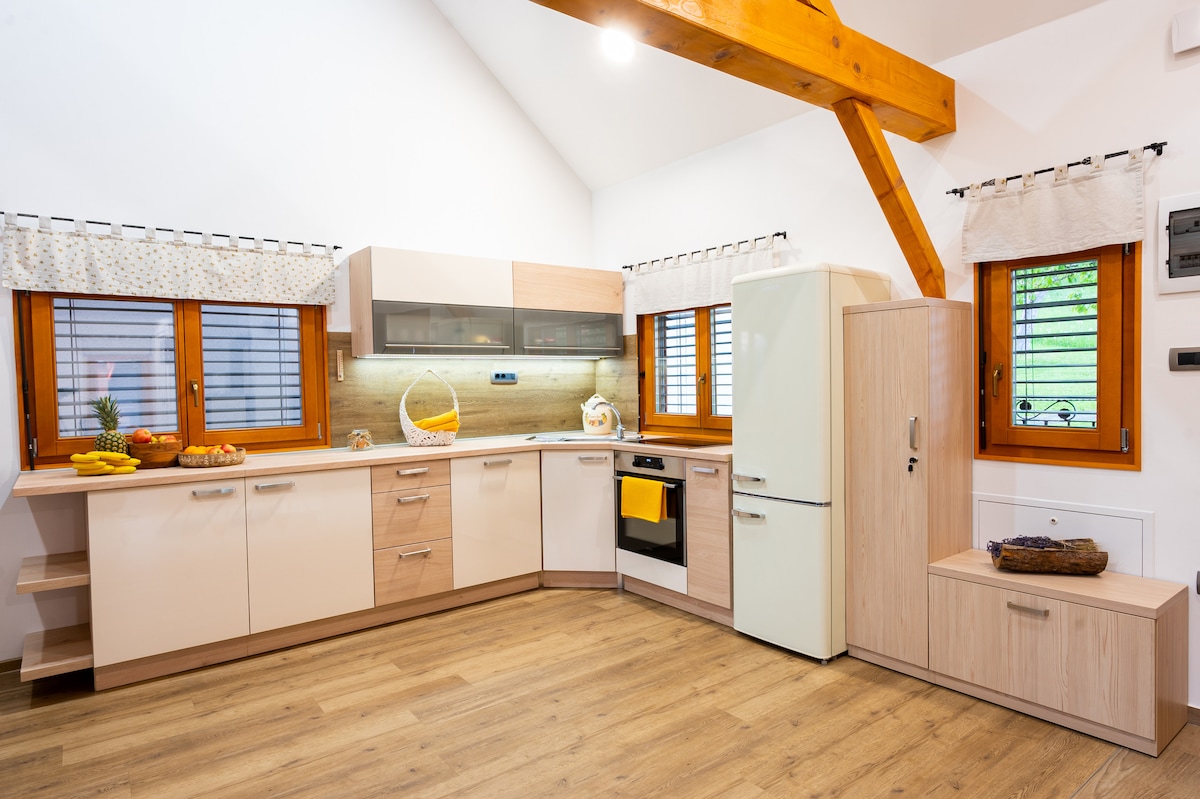 La casa de campo acogedora y cómoda ofrece una cocina moderna y bien equipada. En el jardín hay jacuzzi, sauna, chimenea y barbacoa, donde puedes preparar alimentos y disfrutar de las memorables puestas de sol. El encantador interior de la cabaña es una combinación de madera, vidrio y piedra. El retiro en la cabaña Sončni Grič abrazado por viñedos, bosques y aves enraizadoras te pondrá en contacto con la naturaleza y sus poderes curativos. El Sončni Grič se encuentra a solo un paso de la salida de la autopista Trebnje East.