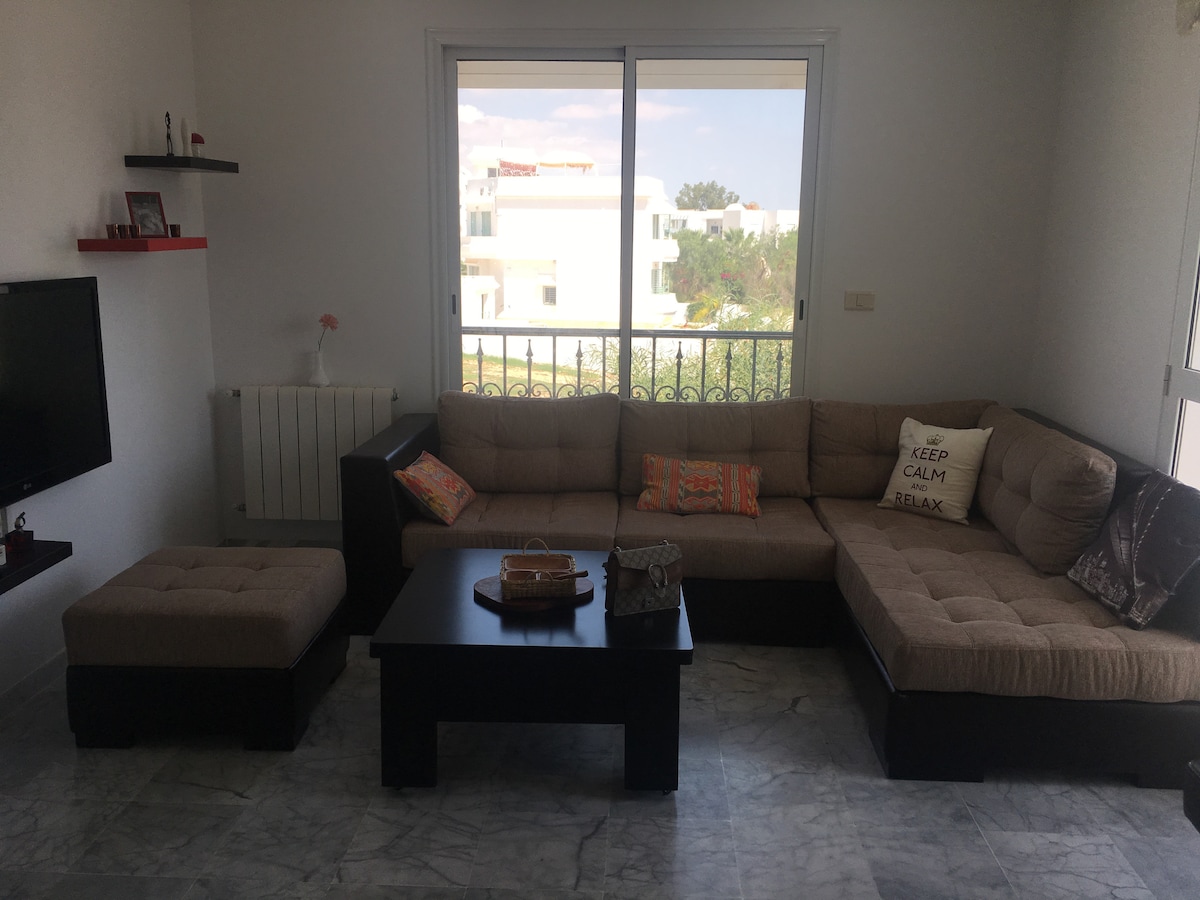 Amplio y luminoso apartamento cerca de la playa, situado en el corazón de la zona turística del norte de Hammamet, zona tranquila y muy discreta. Residencia de lujo segura en una zona residencial, tiendas y ocio cerca (restaurantes, bancos, parque acuático, bares...)