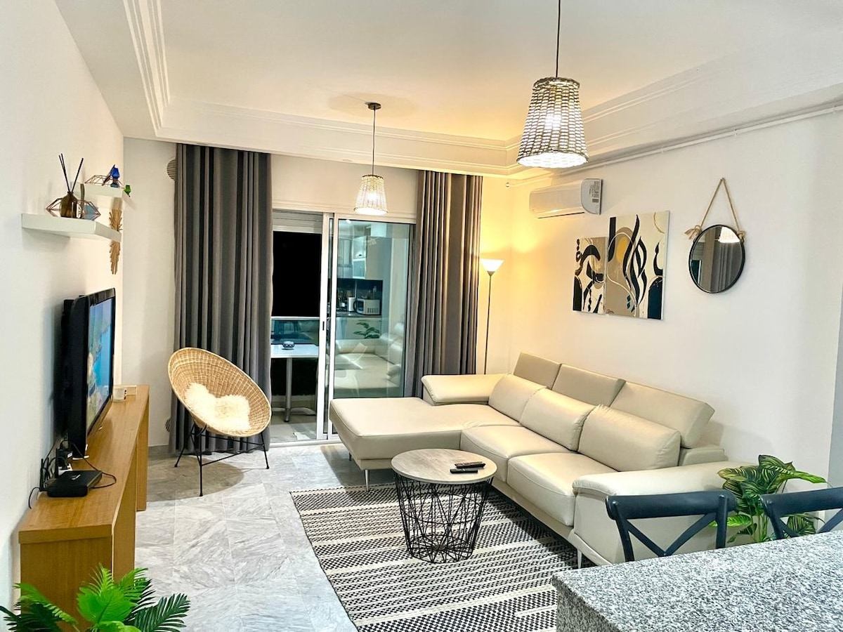 Disfrute de una experiencia elegante en un hermoso alojamiento céntrico, ideal para vivir una experiencia relajante en una zona tranquila en Hamamamt sur situado en una residencia completamente nueva y a poca distancia de la discoteca Calypso y los mejores bares de playa de Hammamet. Su ubicación cerca de una avenida principal y a un paso de la orilla del mar. Nuestro hermoso apartamento está totalmente equipado, dispone de aire acondicionado, muebles modernos y piscina compartida
