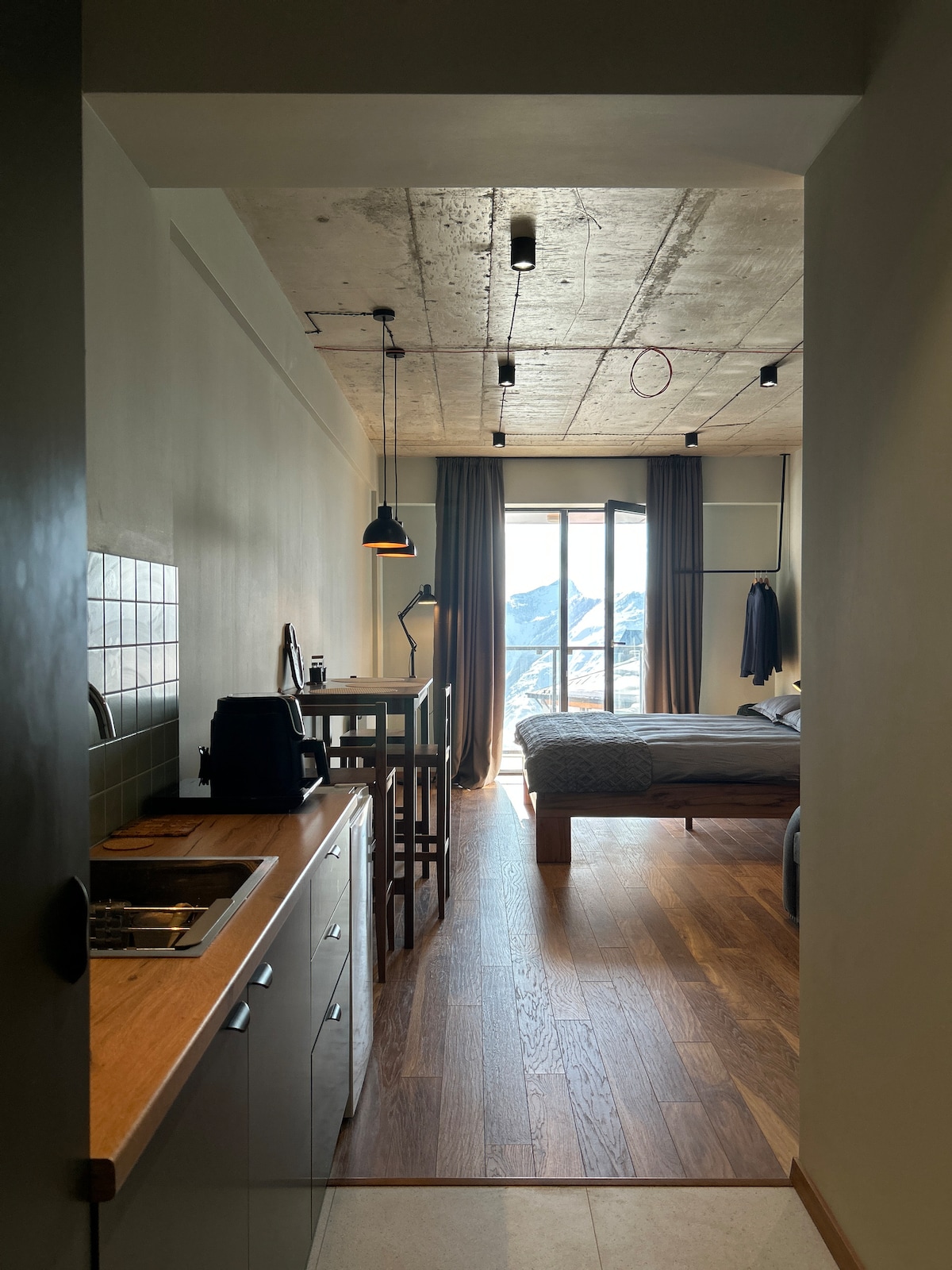 Bienvenido a este luminoso y acogedor apartamento tipo estudio, perfectamente situado en New Gudauri. Ubicación tranquila, aparcamiento privado gratuito y al mismo tiempo muy cerca de todo (supermercado, farmacia, cafeterías, bares y los mejores cursos de esquí). El apartamento ofrece una mezcla armoniosa de confort moderno y un ambiente cálido. Con una cómoda cama, un acogedor sofá, una cocina bien equipada y un baño moderno, tiene todo lo necesario para relajarse y recargar las pilas.