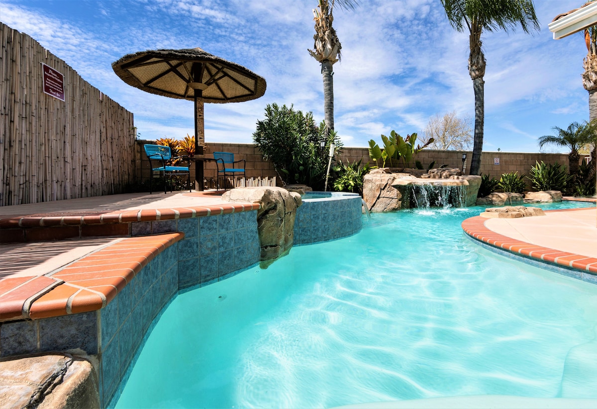 Esta casa privada de un solo nivel es un oasis de laguna estilo resort elegantemente decorado para tus próximas vacaciones en el corazón de la región vinícola de Temecula. ¡El Pacífico Sur te está llamando! Ven a relajarte bajo las palapas tahitianas en este patio trasero de temática tropical y refréscate en su piscina de agua salada con cascadas y un relajante spa/jacuzzi. Disfruta de una parrillada por la tarde en la barbacoa al aire libre mientras pruebas tus bebidas Tiki favoritas.