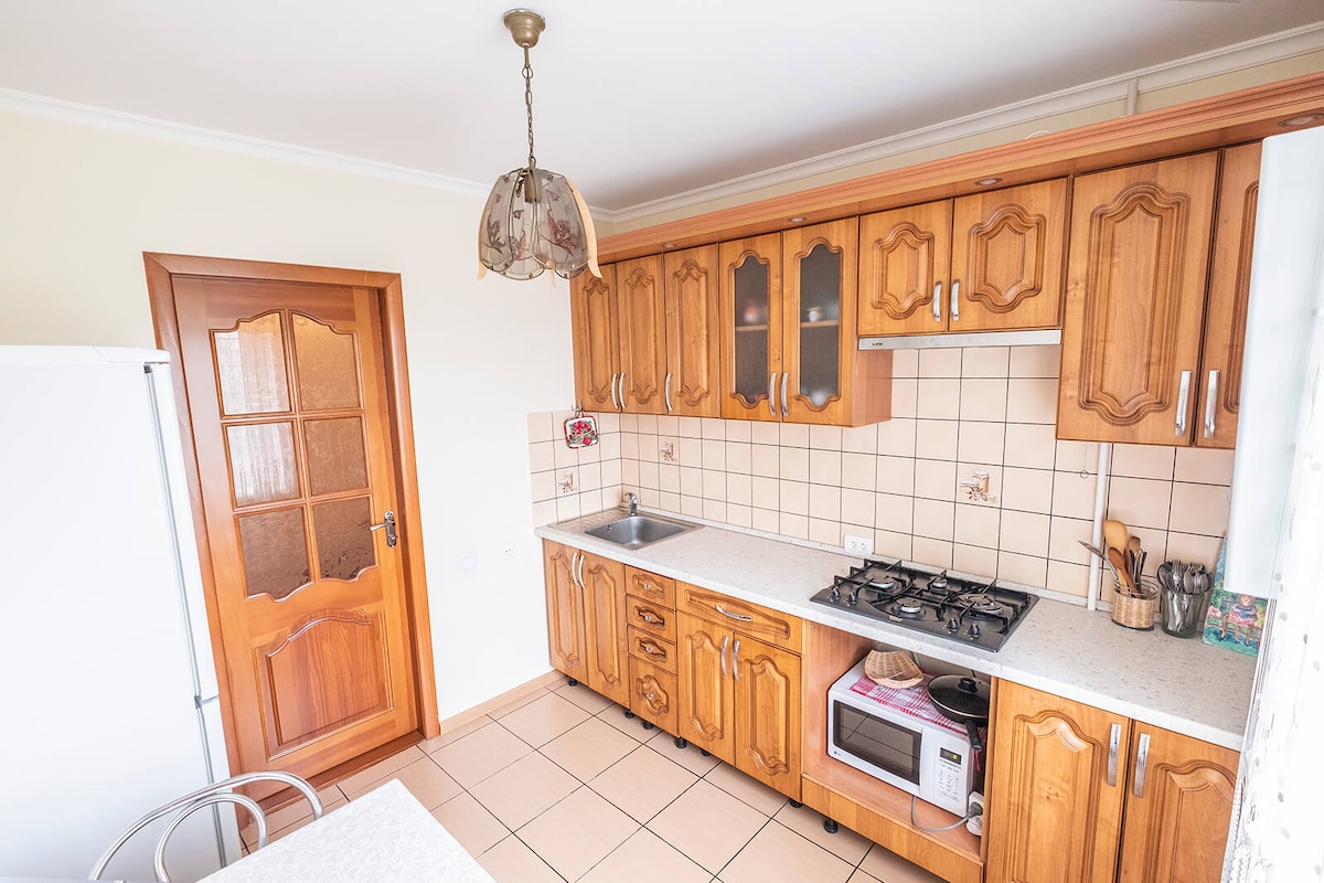 El departamento de 3 habitaciones está ubicado en el segundo piso de un edificio de 9 plantas, que se encuentra en el centro de Kanev, cerca de la estación de autobuses. Al otro lado de la carretera hay un supermercado ATB, que funciona las 24 horas. También cerca del pintoresco terraplén del río Dnieper, la playa y el parque. El departamento cuenta con camas y toallas limpias. La cocina tiene nevera, cocina de gas, microondas, hervidor de agua eléctrico. Puedes cocinar tu propia comida. También se proporciona té, café y azúcar gratuitos.